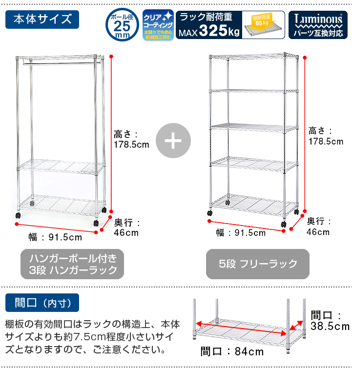 商品スペック 商品名/型番 ルミナスパーツ互換ラック システムワイヤーラック ホームラック 2台セット 3段ハンガーラック(ne25-90183) & 5段ラック(ne25-90185)セット カテゴリ ポール径25mm ルミナス パーツ互換ラック 分 類 スチールラック カテゴリ セット品 サイズ 幅91.5×奥行46×高さ約174cm ※固定足・標準アジャスタの高さ1.3cmを含む (付属のナイロンキャスター取付時の高さは178.5cm) 棚板サイズ 幅91.5×奥行46cm (内寸:幅84×奥行38.5cm) 設置サイズ 91.5×46cm 耐荷重 棚板1枚あたり65kg(他備考参照) コーティング/塗装 クリアコーティング(防錆加工) 素 材 シェルフ(棚)・ポール:スチール、スリーブ:ABS樹脂 重 量 3段ラック:(約)11.55kg / 5段ラック:(約)14.4kg セット内容・付属品 ●シェルフ(棚板)×8枚 ●ポール(支柱)×8本 ●スリーブ(取付部品)×36組 ●アジャスター(固定脚)×8個 ●ハンガーポール×1本 ※ナイロンキャスター8個(ストッパー付4個・ストッパーなし4個)付き 別売りのポール径25mm用足パーツが適応いたします。